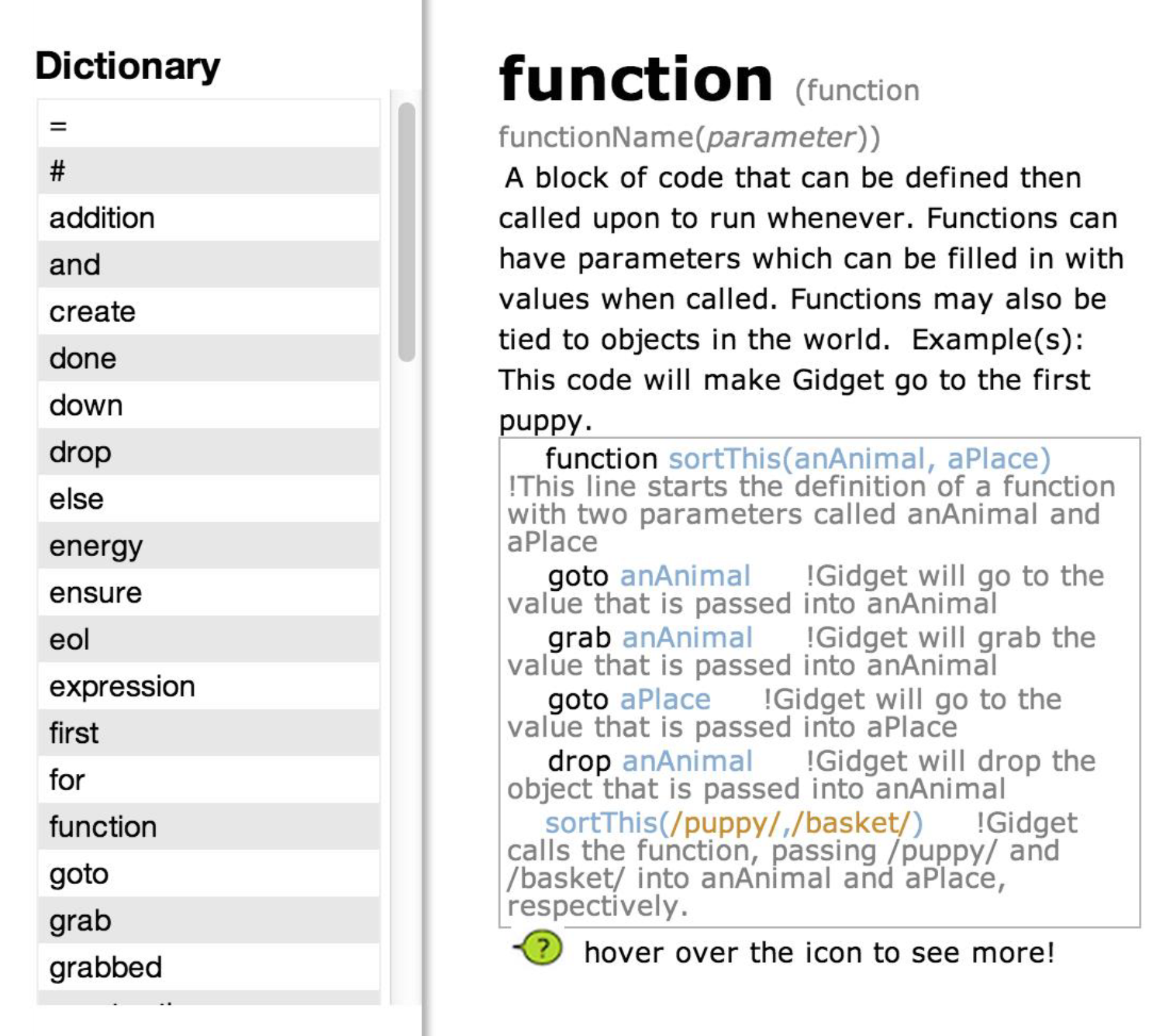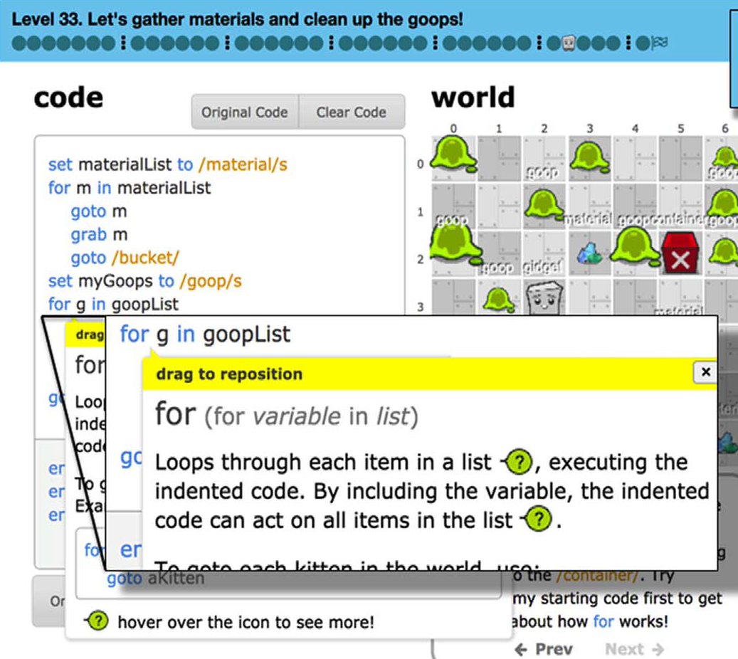 Information Processing Style: Users who favor a comprehensive information processing style can expand and pin tooltips (like the ‘for’ tooltip shown in the screenshot) so they can learn about and compare programming commands in a convenient way and at any time.